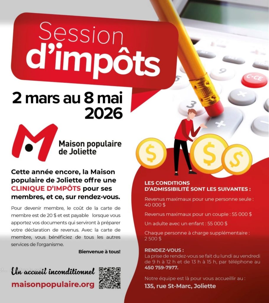 𝐁𝐞𝐬𝐨𝐢𝐧 𝐝’𝐚𝐢𝐝𝐞 𝐩𝐨𝐮𝐫 𝐯𝐨𝐬 𝐢𝐦𝐩𝐨̂𝐭𝐬 𝟐𝟎𝟐𝟓? 𝐍𝐨𝐮𝐬 𝐩𝐨𝐮𝐯𝐨𝐧𝐬 𝐯𝐨𝐮𝐬 𝐬𝐨𝐮𝐭𝐞𝐧𝐢𝐫! Les personnes et familles à faible revenu sont invitées à nous contacter pour prendre rendez-vous. (Grand Joliette et Crabtree) Nous référons les demandeurs vers un service d’aide pour la préparation des impôts et nous en défrayons les coûts, pour les personnes admissibles. Maison populaire de […]